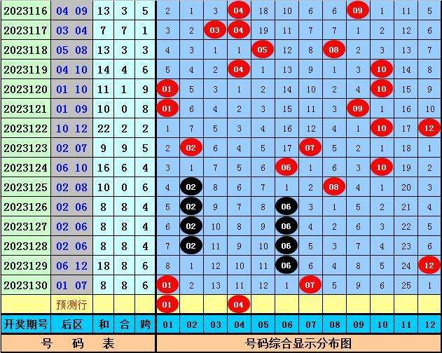 后区:上期奖号为01+07,前9期后区01-12之间的号码开出次数分别为:02、06开出5次,10开出4次,01、04开出3次,07、08、09、12开出2次,03、05开出1次,11没有出现。本期后区注意号码01、02、03、04、06、09,重防两码01、04。