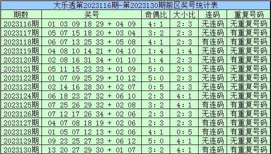 体彩大乐透第23130期奖号开出:13 20 27 29 30+01 07,前区奇偶比为3:2,大小比为4:1,开出连码:29 30,开出1个重复号码:27。
