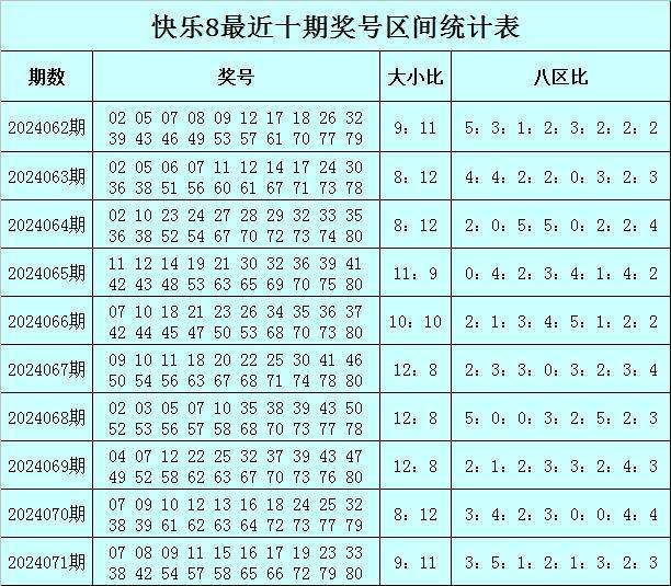 福彩快乐8第2024071期奖号为:07 08 09 11 15 16 17 19 23 33 38 42 54 57 58 65 66 72 79 80,其中奖号大小比为9:11,八区比为3:5:1:2:1:3:2:3。