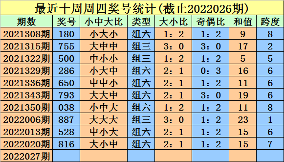 奖号类型判断:近期周四组六明显活跃,近十周开出7次,上周四为组六,组三出现较少,本周四看好在组六。