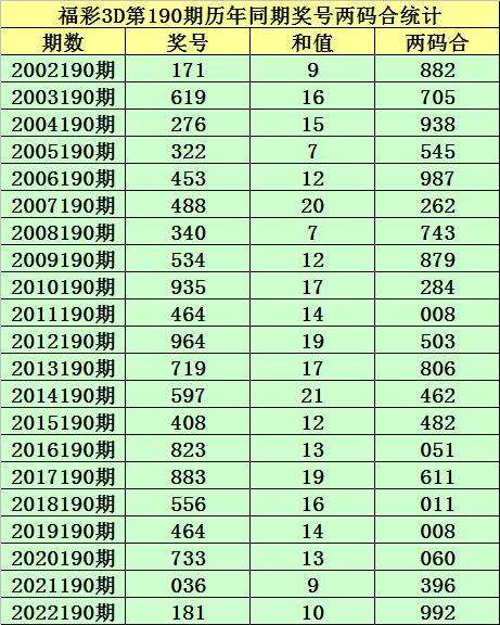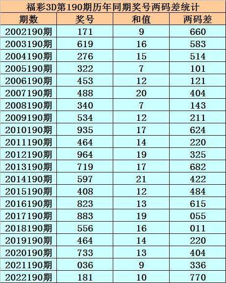 福彩3D第190期,历史上期开出21次奖号,其奖号分别为:171、619、276、322、453、488、340、534、935、464、964、719、597、408、823、883、556、464、733、036、181,奖号两码合差分别开出: