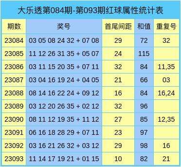 该期前区首尾间距:10,属于低位间距;和值:82,属于:小和值;上期开出1枚重号21。