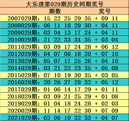 三、连号分析:在第029期历史同期奖号中只有8期出现了连号,分布在第2008029期、第2009029期、第2010029期、第2012029期、第2013029期、第2014029期、第2016029期、第2021029期,出现比例为53%,本期预计连号继续走冷,排除连号。