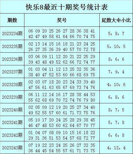 福彩快乐8第2023243期开奖回顾:07 19 22 23 24 25 26 27 32 35 36 44 45 54 55 57 61 71 73 75,其中包含4个小尾奖号:22、32、61、71;包含12个中尾奖号:23、24、25、26、35、36、44、45、54、55、73、75;包含4个大尾奖号:07、19、27、57。