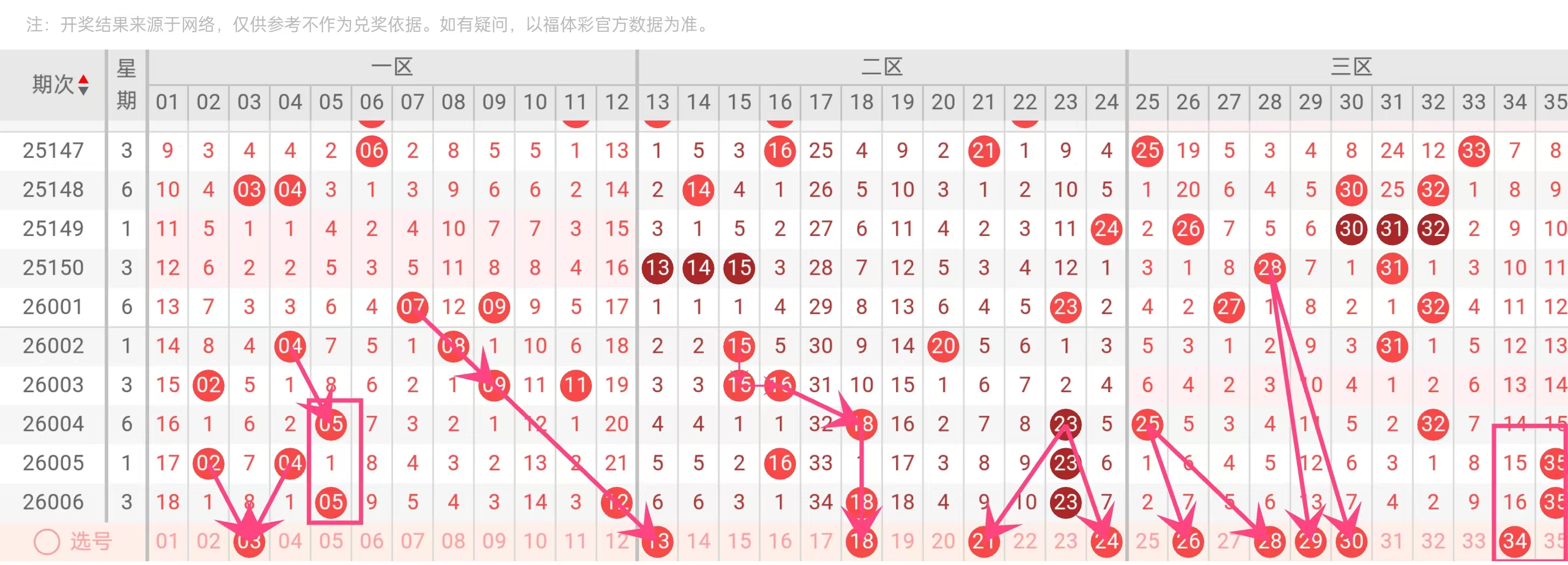 从近期走势看,前区号码分布呈现“中后段集中、小号区匮乏”的特征。近5期前区以中号(15-23)和大号(31-35)为主,小号(01-10)仅出现“02、04、05、08、09”,尤其01、03、06、07、10等已多期未见。因此本期重点防小号回补,01作为长期冷号(近10期未出)有较强解冻可能;09近期出现后仍有重复概率;13、14属于中前段遗漏较深的号码,历史上多在冷态后突现。中号区关注17(与近期热号15、16形成斜连趋势)、20(近期已出,防重复)、22(邻号23过热,防对称转移)。后段号码中,25近期已出,仍属温热号;28作为2字头中遗漏值较高的号码,有较好弹出机会;33在近20期出现频率偏低,且与近期32、35形成大号区扩散趋势,值得关注。