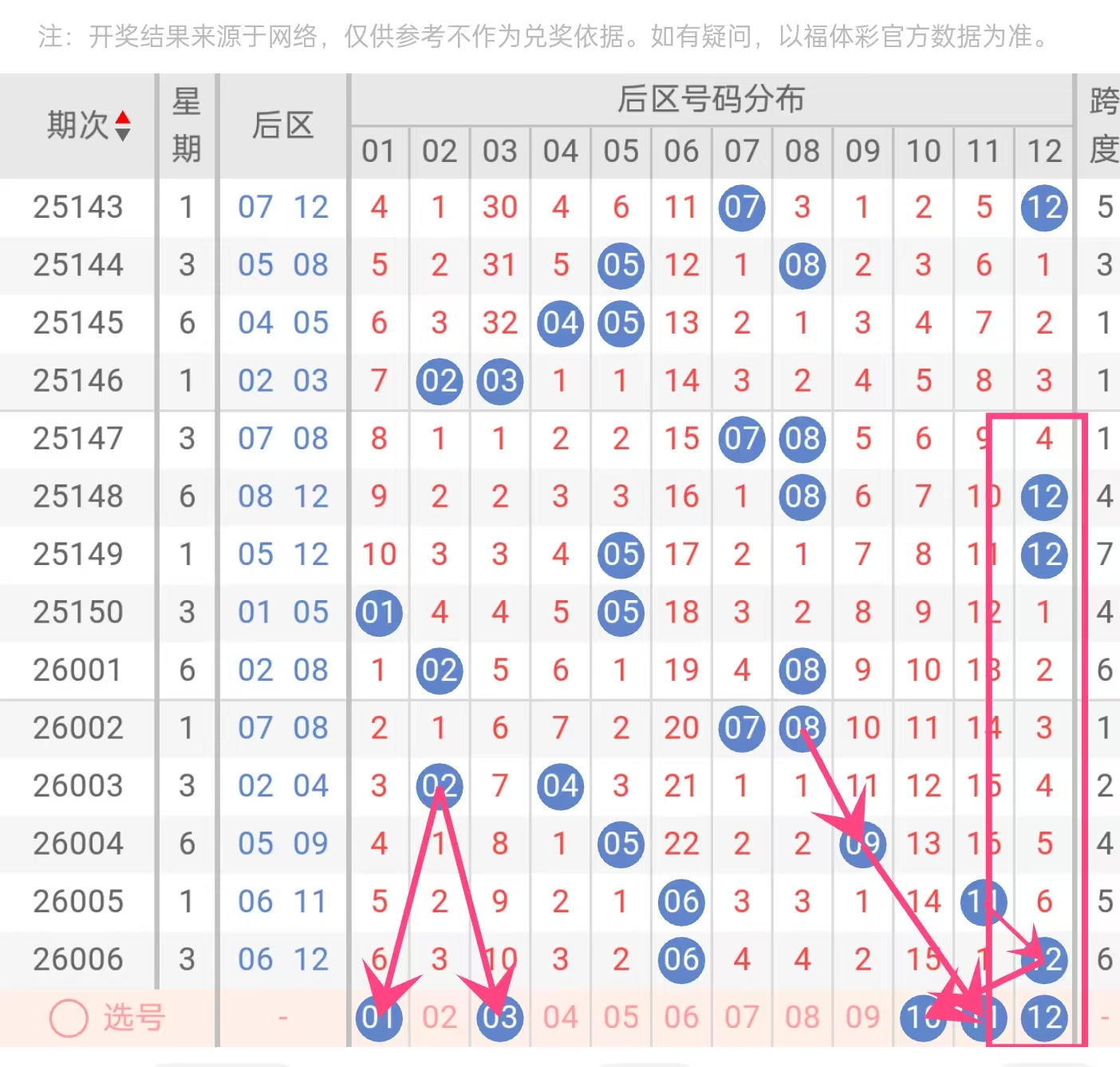 后区方面,近5期后区以中小号为主(02-09),且多集中在06、08等偶号。本期看好后区向“一大一小”或“双中大”组合过渡。03作为冷号(近10期仅出1次),与热号02、04形成夹码,弹出概率高;07、08属温热号,近期08连续出现,仍有重复可能;10是后区中段冷号,历史常伴随09、11出现,本期可防;12作为最大号,近期已出,且后区大号(10-12)在历史走势中常连续活跃。整体后区组合建议关注“03+10”“07+12”“08+12”等模式,兼顾奇偶、大小均衡。