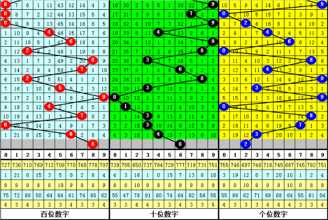 3、号码0-9出现开出频次分别为:号码6出现20次,号码1出现18次,号码5出现17次,号码9出现16次,号码8出现15次,号码0出现10次,号码3、4出现9次,号码7出现8次,号码2出现7次。一般来说,表现最冷的三码:2、4、7不会同时出现,本期杀一码:7;表现最热的四码:1、5、6、9中一般会出现奖号,本期注意号码;6。