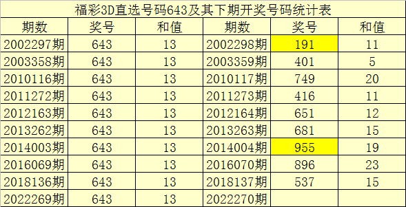 一、开奖回顾:第2022269期福彩3D奖号为643。奖号奇偶比为1:2,和值为:13,跨度为:3。