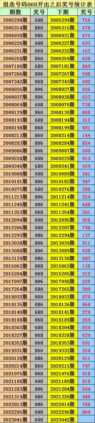 排列三组选068出现之后下期分别开出:756、670、675、633、162、628、849、598、492、026、653、738、808、312、481、144、854、500、913、939、241、947、280、254、648、301、956、790、137、911、030、043、138、212、228、309、870、064、279、269、020、629、691、254、011、797、018、810、504、940、788、009。