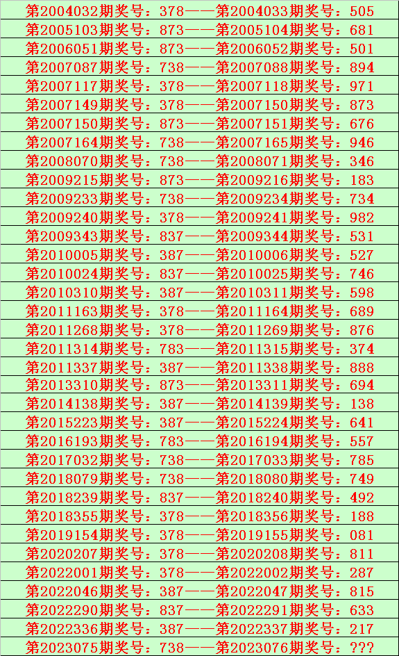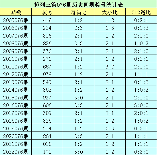 排列三第2023076期开奖日期:2023年3月27日,历史上第076期已开出了18次奖号,历年同期号码分别为:418、224、316、826、376、271、667、078、545、382、937、606、389、328、214、864、018、171。
