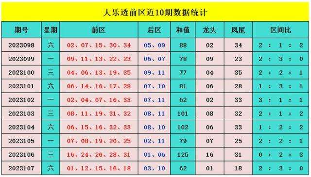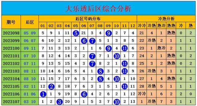 上期回顾:大乐透第2023107期:前区01、12、15、16、18,后区03、10,前区奖号和值为62,三区比为2:3:0,后区开出奇偶组合03、10