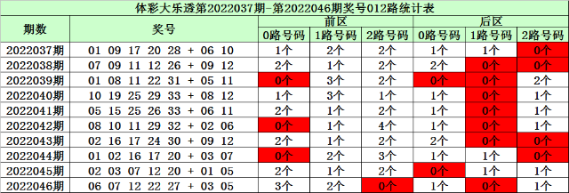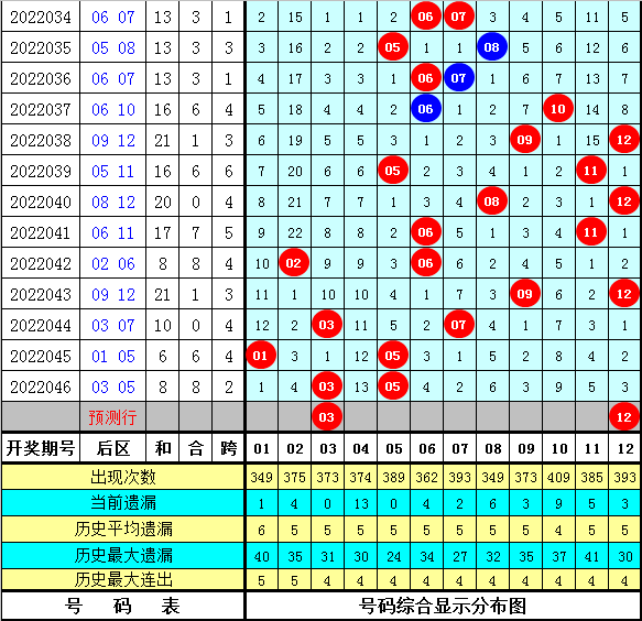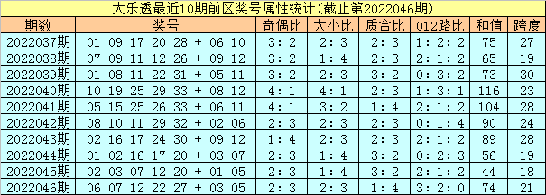 开奖回顾:体彩大乐透第22046期开出奖号为:06 07 12 22 27+03 05,前区奇偶比为2:3,大小比为2:3,012路比为3:2:0,质合比为1:4,后区奇偶比为2:0,大小比为0:2,012路比为1:0:1,质合比为2:0。