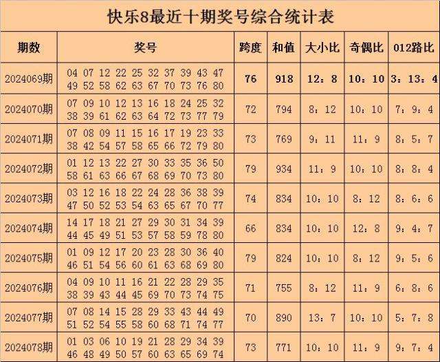 福彩快乐8第2024078期开出奖号:01 03 06 10 19 21 28 29 34 39 46 48 49 50 57 60 63 65 69 74,其中奖号跨度开出73,和值开出771,大小比开出10:10,奇偶比开出11:9,012路比开出9:7:4。