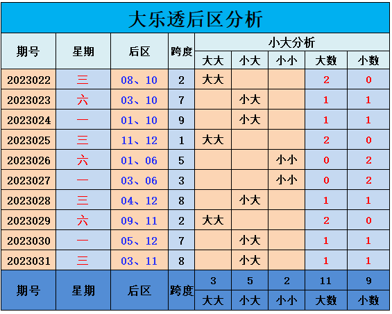 最近10期后区大小比为11:9,最近10期后区大大组合开出3期,小大组合开出5期,小小组合开出2期。上期开出小大组合,本期看好小小组合出现。