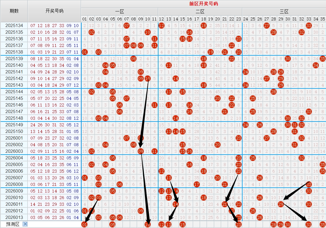 回顾上期26013期开奖03 05 06 23 26 + 01 04,其中一小区01-12出3个,二小区13-24出1个号,三小区25-35出1个!