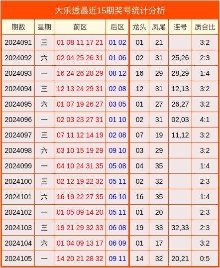 后区分析:最近15期后区号码中,质合比为14:16,偶数出现的概率较高。本期预测后区号码为01、05。