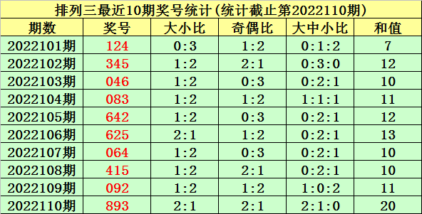 上期回顾:排列三第2022110期奖号为:893。奖号类型:组六,和值:20,奇偶比:2:1,跨度:6,大小比:2:1。
