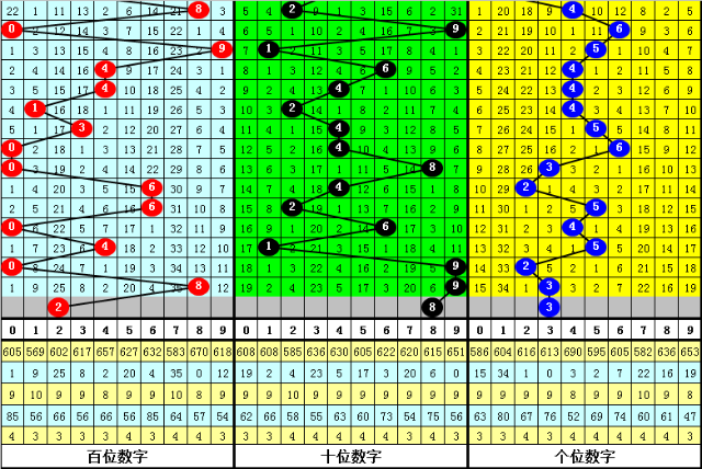 大中小分析:在组选0-9号码分布图中,前10期小号(0-2区段)出现10枚奖号,中号(3-6区段)出现16枚奖号,大号(7-9区段)出现4枚奖号,上期0小号区域断区,本期预计大中小区域各出1枚奖号。