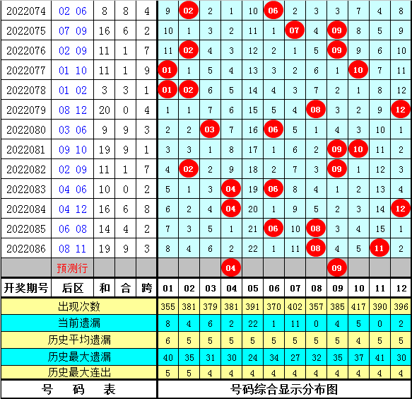 3。出号统计:所有奖号都出现了,其中04号码开出次数最多,为5次。