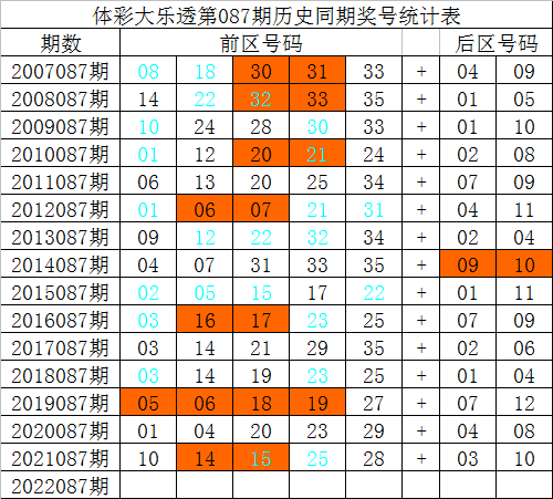 体彩大乐透第087期历史上已开出了15次,其奖号分别为: