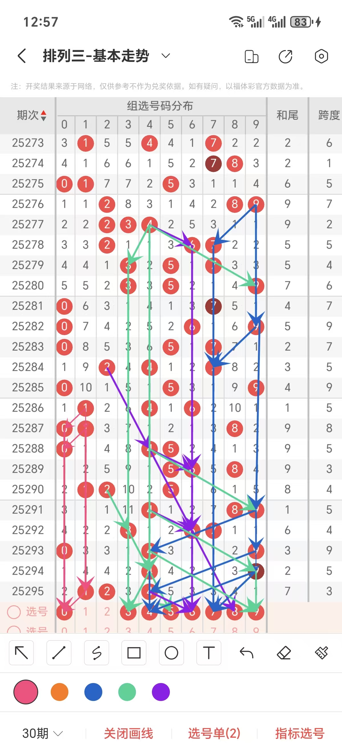 通常情况下在五期之内重复一个跨度的概率较高,近五期重复了5的跨度,近五期跨度为5/4/9/5/3,近期02路的跨度较热,本期要侧重3/5跨为主的号码组合。选择好跨度就可以从跨度方面选择相应的双胆码组合,双胆码的选取要根据近期和历史的走势进一步的分析选取。