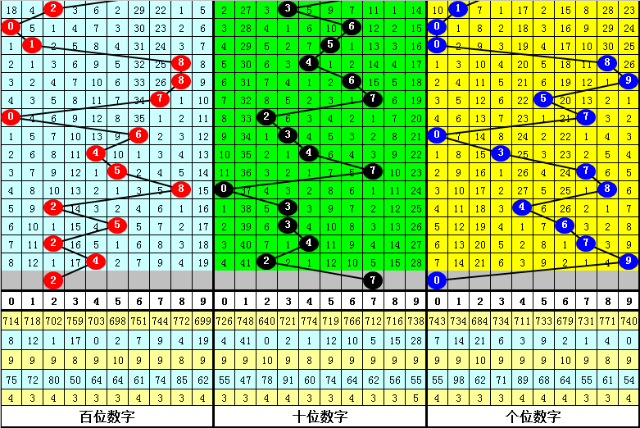 4、组选号码012路比为53:57:59,其中0路号码轮空13期,1路号码轮空10期,2路号码轮空10期,本期012路比参考1:1:1组合。
