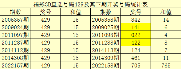 一、开奖回顾:第2022157期福彩3D奖号为429。奖号奇偶比为1:2,和值为:15,跨度为:7。