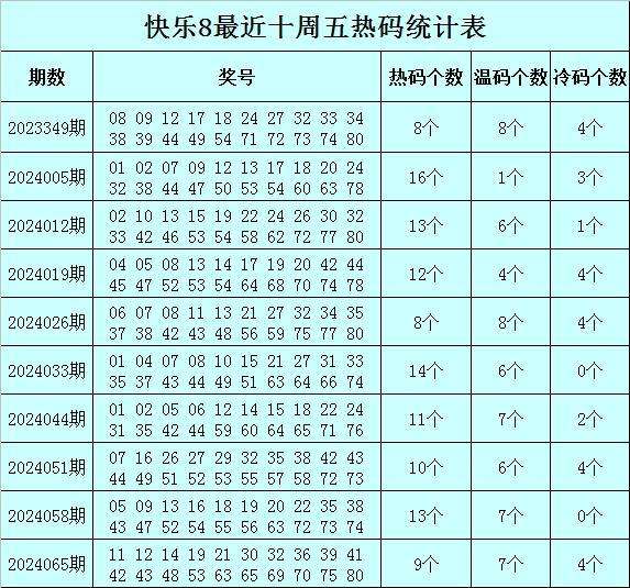 福彩快乐8第2024065期(上周五)开奖回顾:11 12 14 19 21 30 32 36 39 41 42 43 48 53 63 65 69 70 75 80,其中奖号遗漏总值为81,冷温热码比为4:7:9。