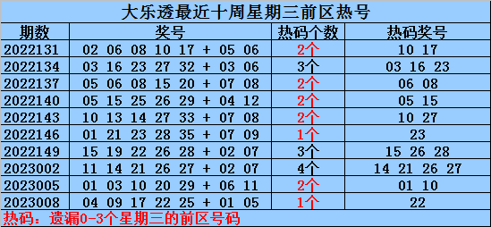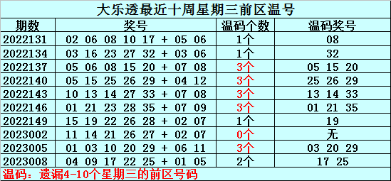 冷号:最近十周星期三前区开出8个冷号,上周星期三冷号出现2个,本周星期三注意冷号18。
