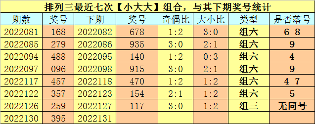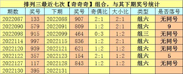 奖号类型分析:排列三最近七次【小大大】组合与【奇奇奇】组合出现之后,其下期组三号码开出2次,组六号码开出12次,其中组六号码开出频率非常热,本期预计继续开出组六号码。另外,其下期有6期没有出现重号,本期不看好开出重号。