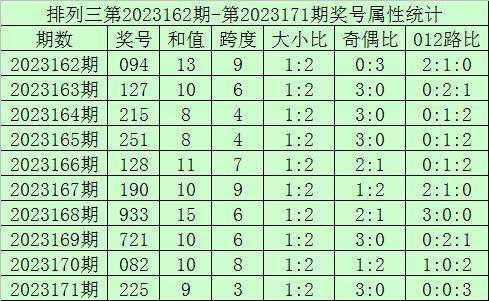 上期回顾:排列三第2023171期开奖号:225,奖号和值:9,奇偶比3:0,大小比1:2。
