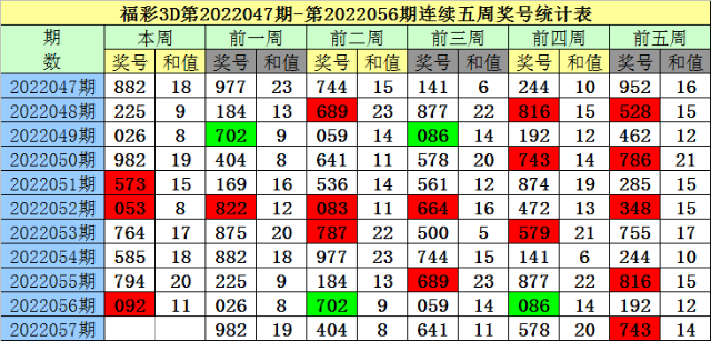上期回顾:福彩3D第2022056期开奖奖号为:092,奖号类型为:组六,奖号冷温热态为:热号+热号+热号。