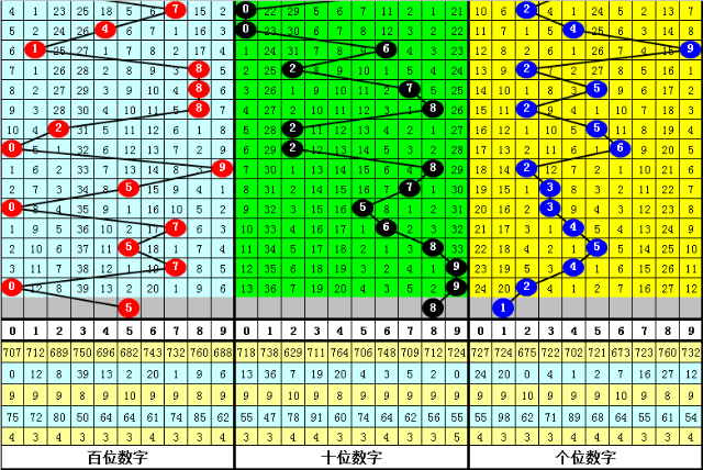 百位上期出现:热号0,该位连续十期以热号出现较多,以冷号出现较少,目前百位热号有3个:0、5、7,本期看好开出热号再次出现,参考号码5。