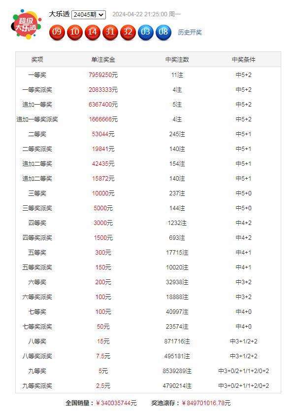 大乐透第2024045期开出奖号为09、10、14、31、32+03 08。其中前区奇偶比为2:3,三区比为2:1:2,大小比为2:3,后区开出一大一小组合。