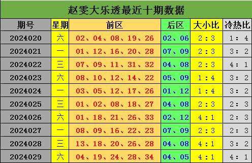 上期回顾,大乐透第2024029开奖,本期奖号:前区04 19 24 28 34;后区04 05,当期前区号码大小比为4:1,三区比1:2:2,奇偶比1:4。前区未开出连号,开出重号28。