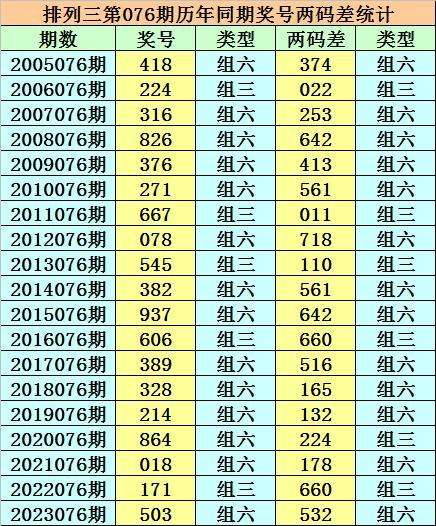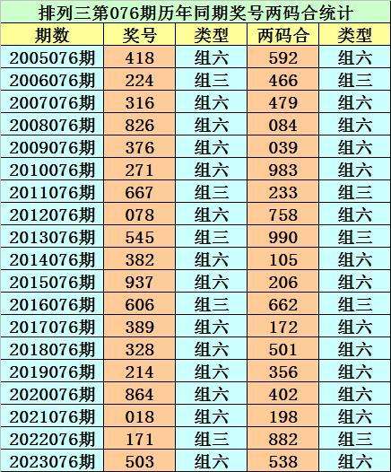 排列三从2004年开奖至今已开出6847期奖号了,其中第076期历史同期奖号出现19次,历年第076期分别开出号码:418、224、316、826、376、271、667、078、545、382、937、606、389、328、214、864、018、171、503。