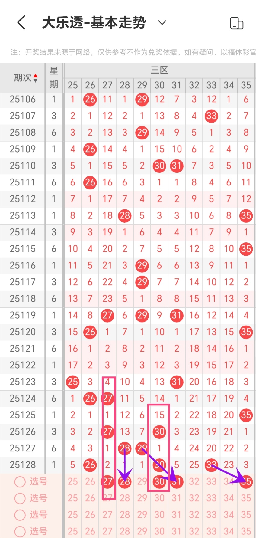 各位兄弟姐妹们大家好,我是nice,我喜欢研究数字的走势规律以及数据分析,通过同期次、同日期、同星期奖号等等出号规律进行杀号和做数据条件,红球杀号的准确率和稳定度都相当不错,首先通过上面的模块进行杀号可以做到杀红球12枚,然后将杀号带入到数据条件中进行选胆,这种方法屡试不爽帮助自己排除很多不必要的号码,将红球选号的数量控制在8-12枚,结合红球杀号带入到数据条件中选出的胆码,做胆拖组合控制成本