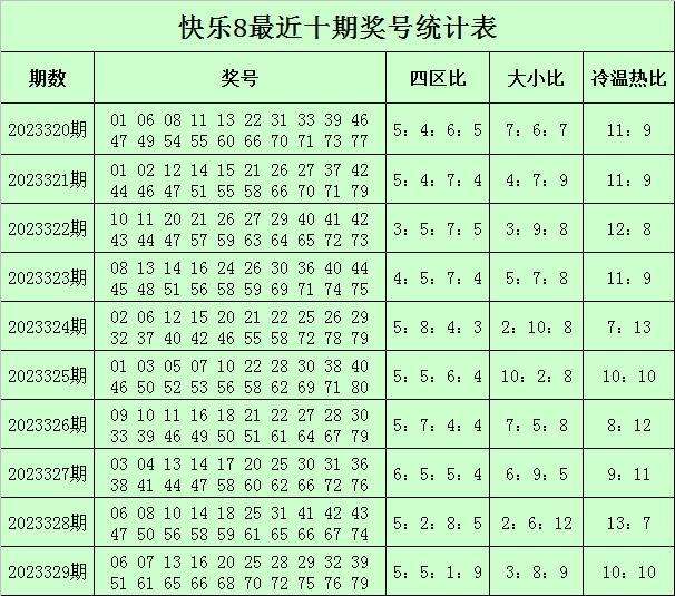 福彩快乐8第2023329期开奖回顾:06 07 13 16 20 25 28 29 32 39 51 61 65 66 68 70 72 75 76 79,其中奖号四区比为5:5:1:9,冷温热码比为3:8:9,大小比为10:10,和值为898,同尾号码为20 70、51 61、32 72、25 65 75、06 16 66 76、28 68、29 39 79。
