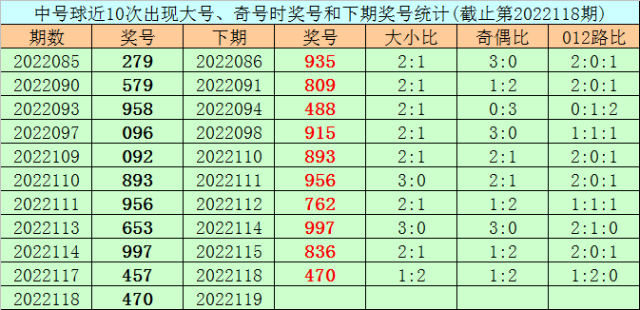 在中号球前10次开出大号、奇号类型之后,其下期分别开出奖号:935、809、488、915、893、956、762、997、836、470,其中号码奇偶比为7:3,大小比为6:4,012路比为6:2:2。