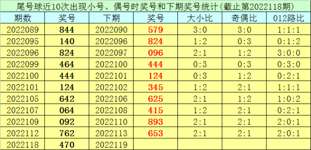 开奖回顾:体彩排列三第2022118期开出奖号470,奖号大小比开出1:2,奇偶比开出1:2,012路比开出1:2:0。