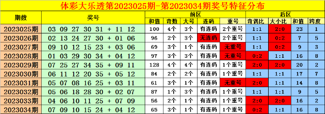 上期回顾:体彩大乐透第2023034期奖号:07 09 10 15 24+04 12。前区和值为65,3个奇数,1个大号,有连码,1个重号;后区奇偶比0:2,大小比1:1,和值16,跨度8。
