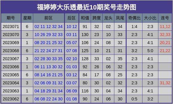 072期福婷婷大乐透预测奖号:和值+连号分析