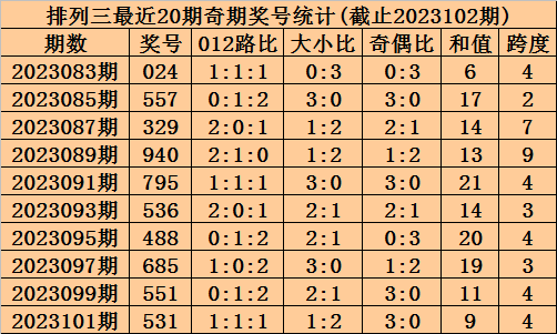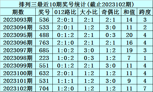 上期回顾:排列三2023102期奖号为704,奇偶比为1:2,大小比为1:2,跨度为11。