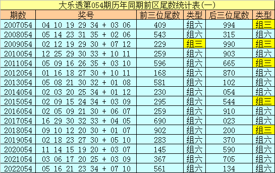 在大乐透第054期历年同期奖号中,前区后三位尾数出号频次分别为:尾数0出现12个,尾数9出现7个,尾数5出现6个,尾数3、4出现5个,尾数1出现4个,尾数2、7出现3个,尾数6出现2个,尾数8出现1个。其中尾数数字三类型豹子、组三、组六次数比为0:5:11,今年同期后三位尾数类型参考组六;