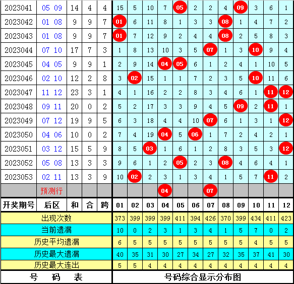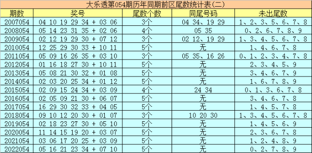 大乐透历年同期第054期后区尾数奇偶比为19:13,最近5年尾数奇偶比为8:2,后区尾数大小比为13:19,最近5年尾数大小比为5:5,本期后区注意号码02、03、04、07、10,后区两码关注04、07。