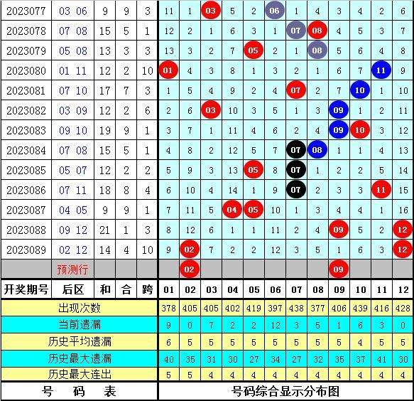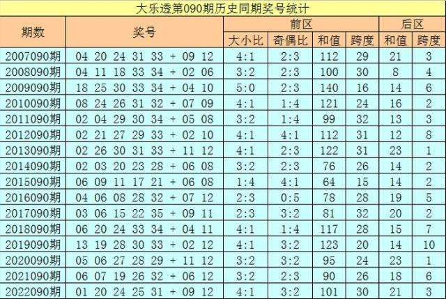 2、后区和值分析:在第090期历史同期奖号中,后区和值分别为:21-8-14-16-13-12-23-14-14-19-20-15-14-23-18-21,和值012路比为5:3:8,奇偶比为7:9,大小比为14:2,今年第090期看好出现小号和值,关注和值11。