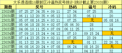 大乐透第23029期-第23038期前区奖号冷温热分布统计: