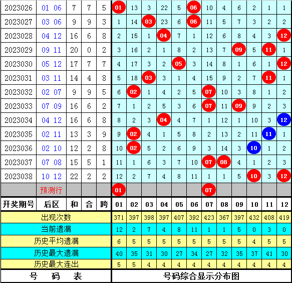 后区判断:上期后区奖号为10和12,开出热码+热码组合。最近十期后区开出13个热码、3个温码和4个冷码,本期预计奖号关注冷码+热码组合,参考两码01、07。