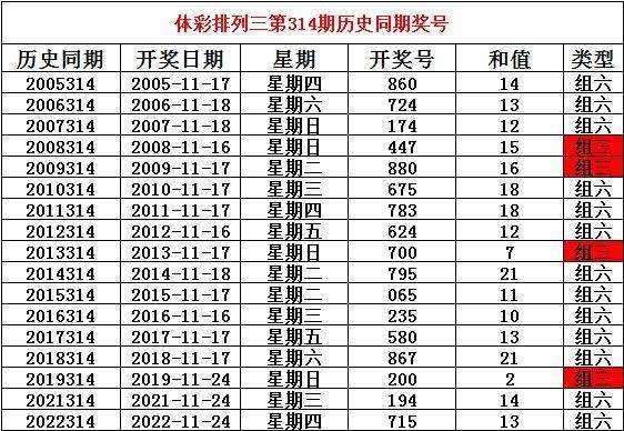 2023年11月24日排列三第314期开奖,历史同期分别开出奖号: