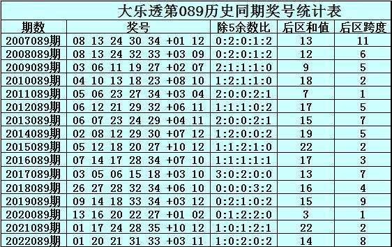大乐透历年同期第089期前区奖号除5余数统计分析: